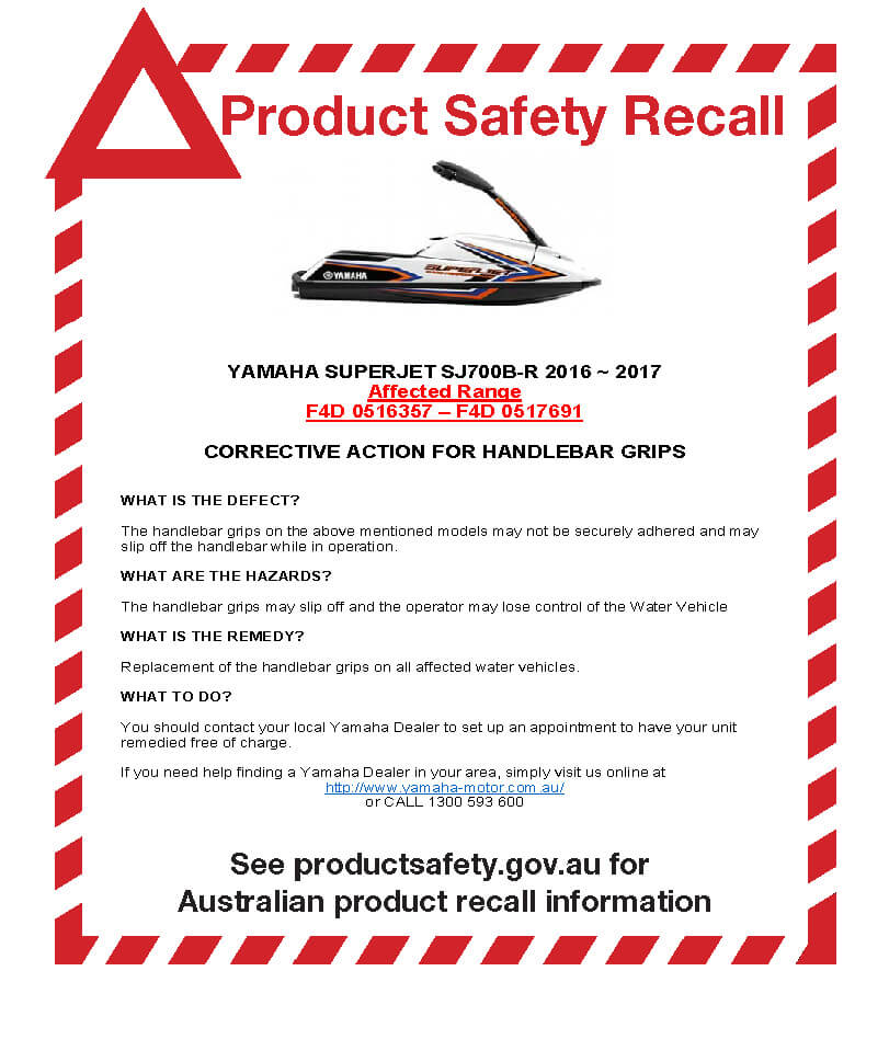 YAMAHA SUPERJET SJ700B-R 2016 ~ 2017 Affected Range F4D 0516357 – F4D 0517691 CORRECTIVE ACTION FOR HANDLEBAR GRIPS Download Product Safety Revall YAMAHA SUPERJET SJ700B-R 2016-2017 View More