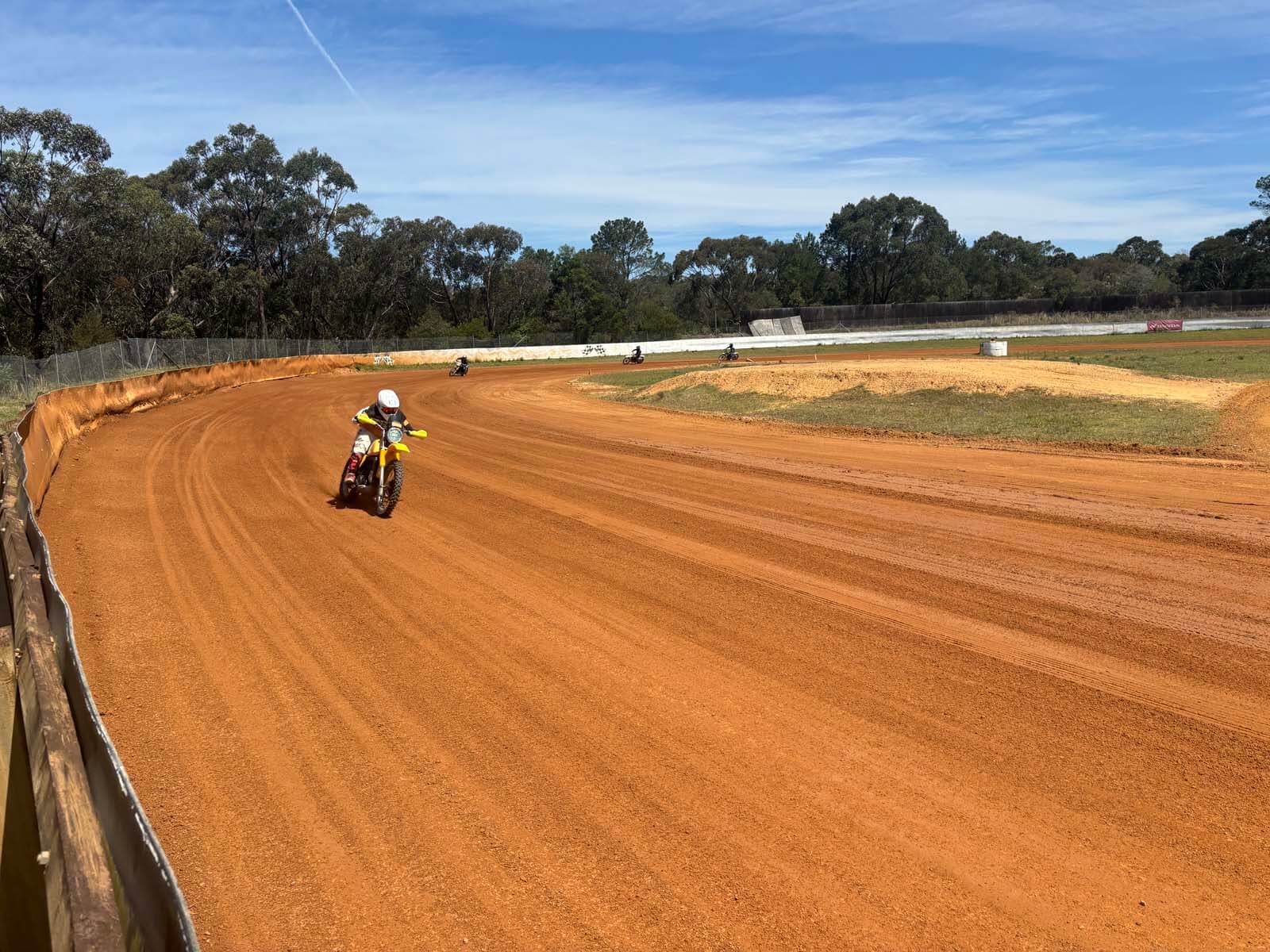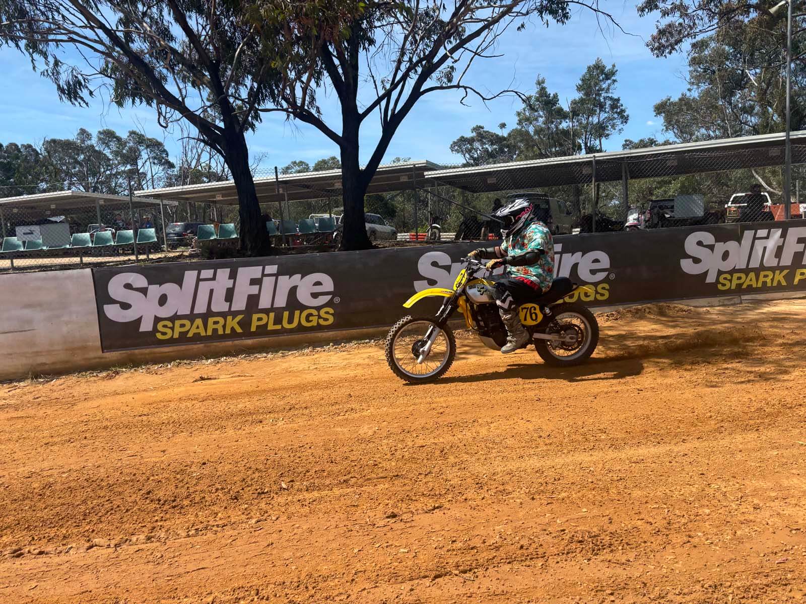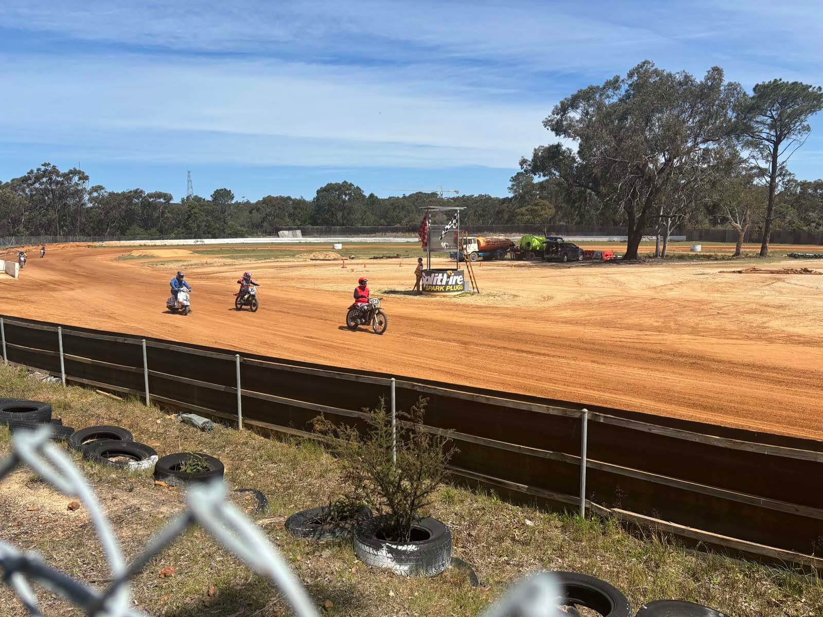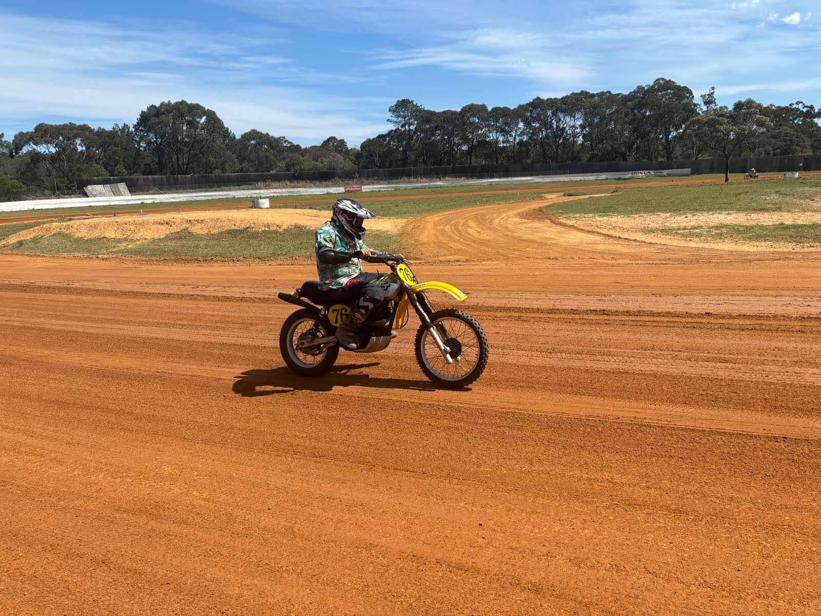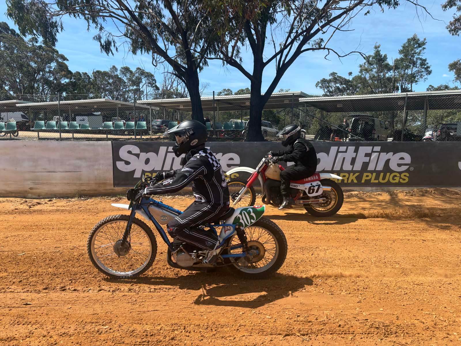 Sean's first race at Nepean dirt track in Western Sydney ended in a long walk back to the pits. The oversized 34mm carby did not want to deliver the right mix to the old chook chaser. And then the coil failed to provide a spark. Fortunately for Sean, the vintage dirt track community – aka the Jerkyls -  gathered round, donated an emergency coil and Sean managed to ride a few laps. Slowly.