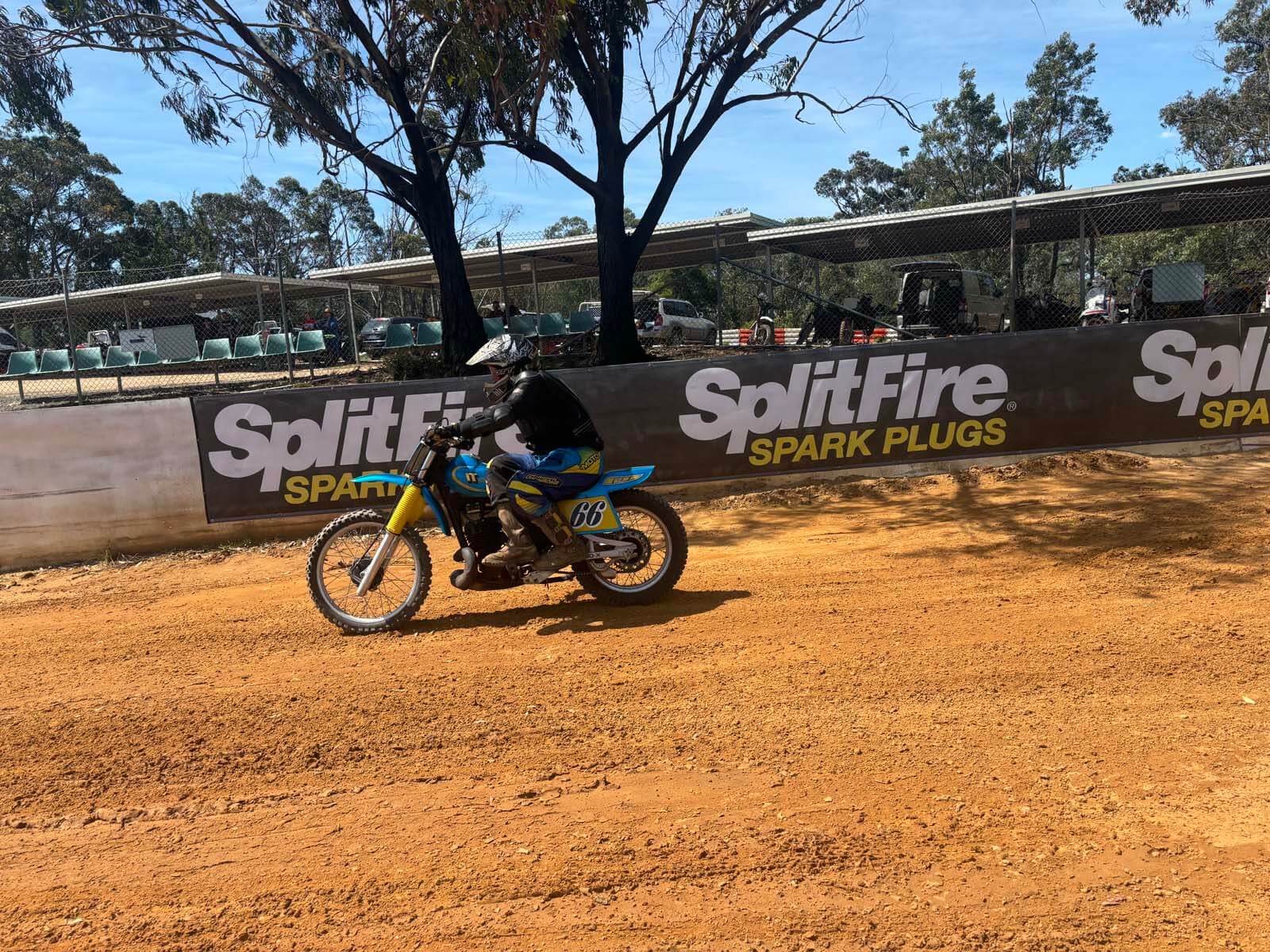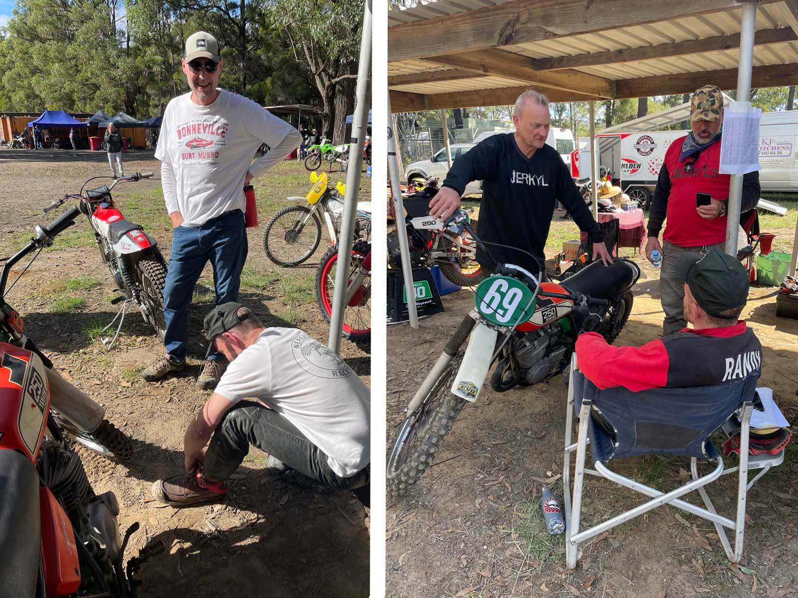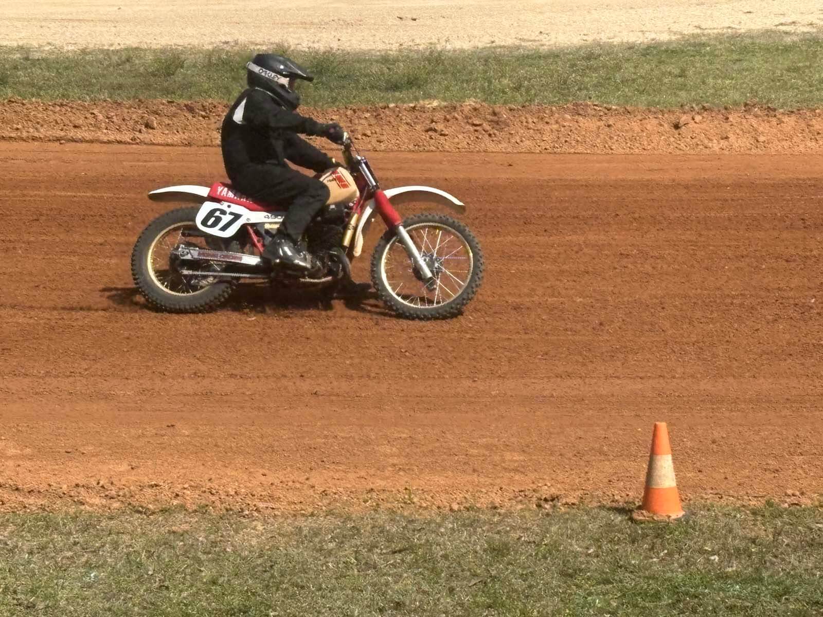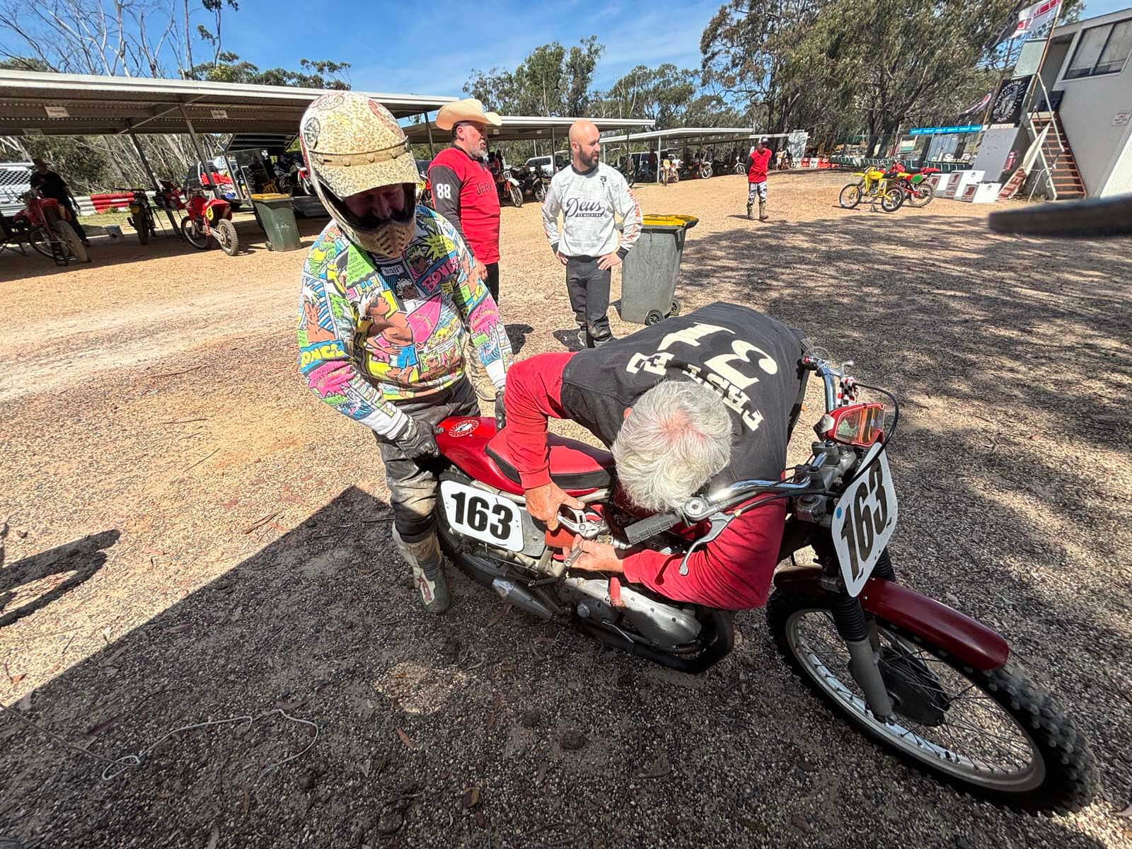 Sean's first race at Nepean dirt track in Western Sydney ended in a long walk back to the pits. The oversized 34mm carby did not want to deliver the right mix to the old chook chaser. And then the coil failed to provide a spark. Fortunately for Sean, the vintage dirt track community – aka the Jerkyls -  gathered round, donated an emergency coil and Sean managed to ride a few laps. Slowly.