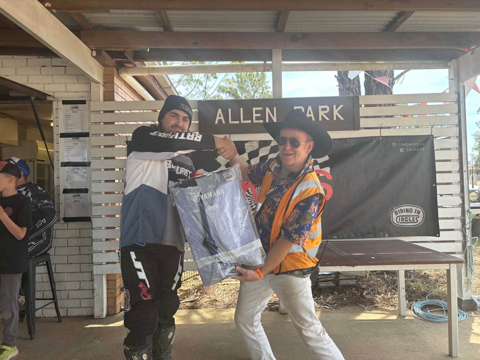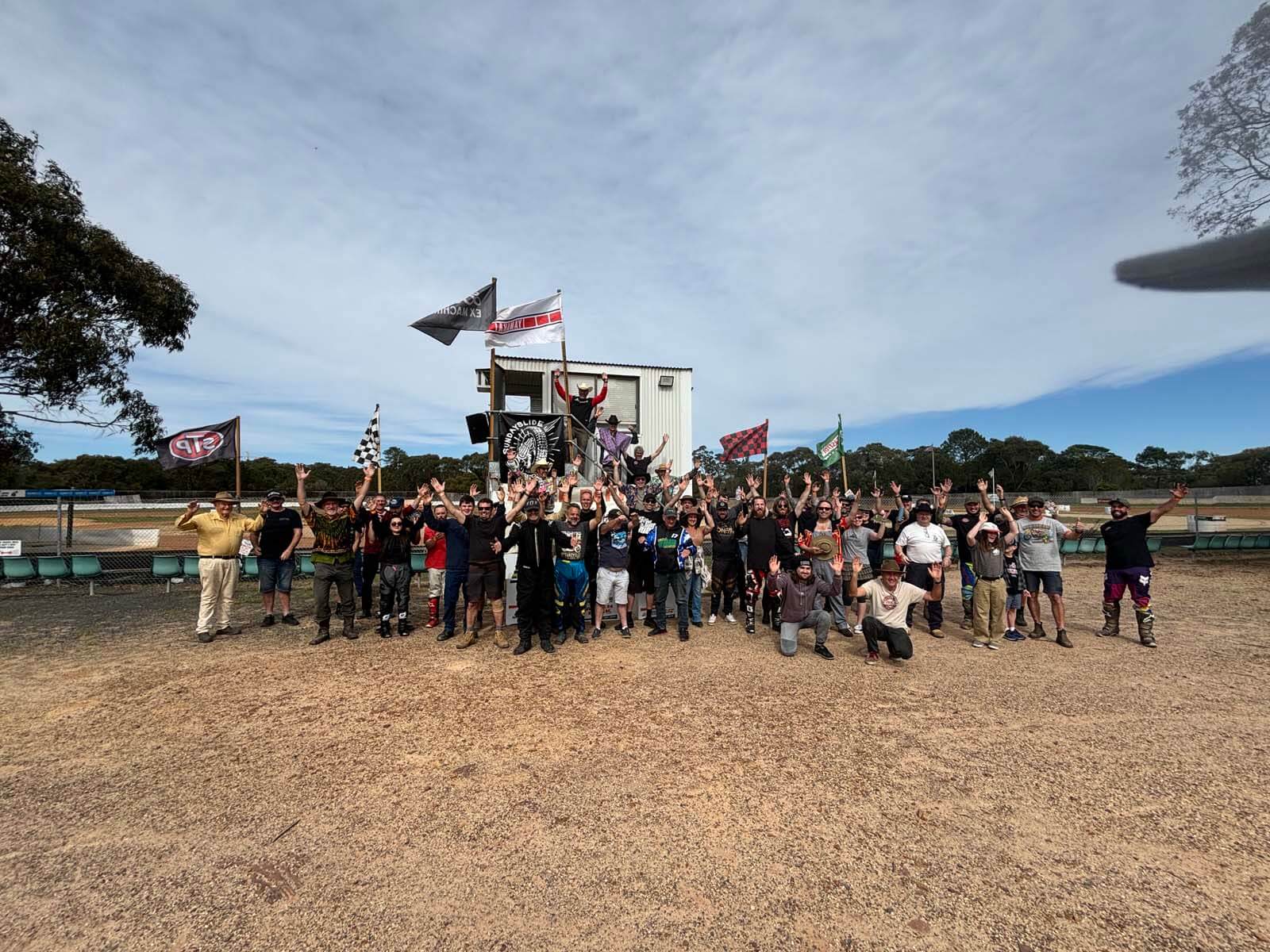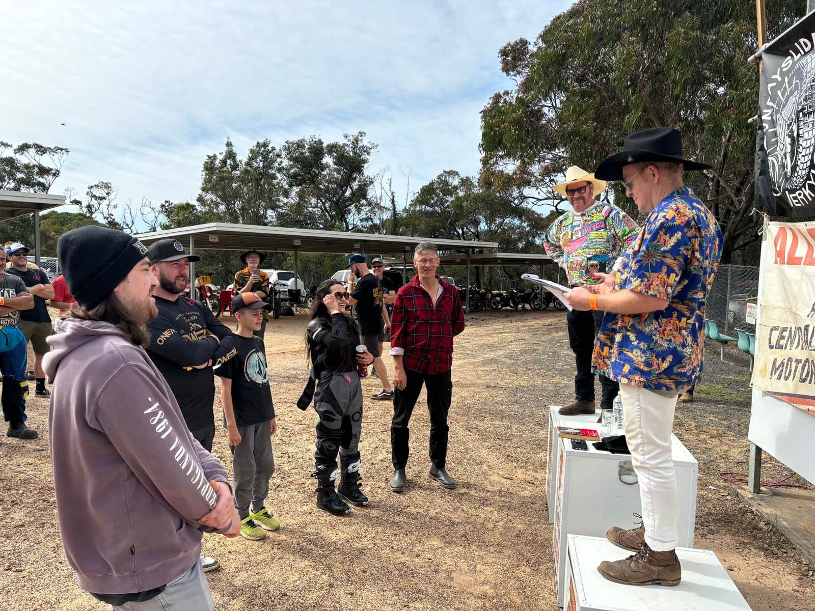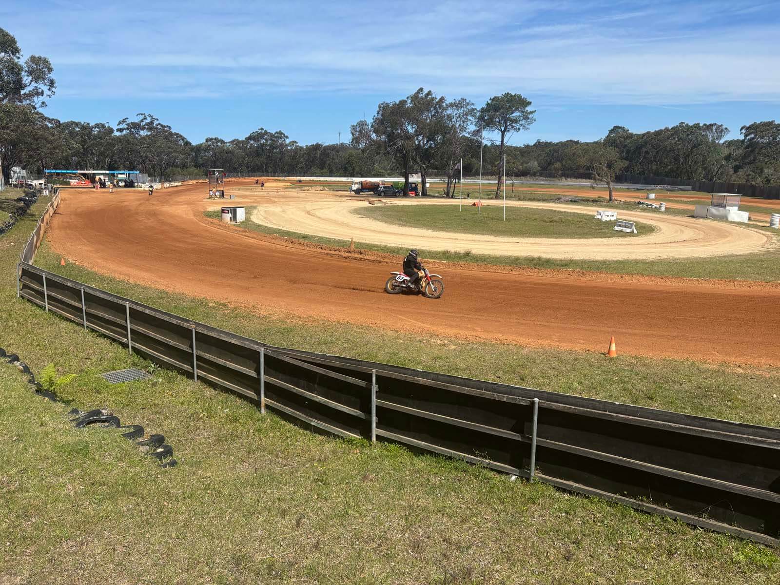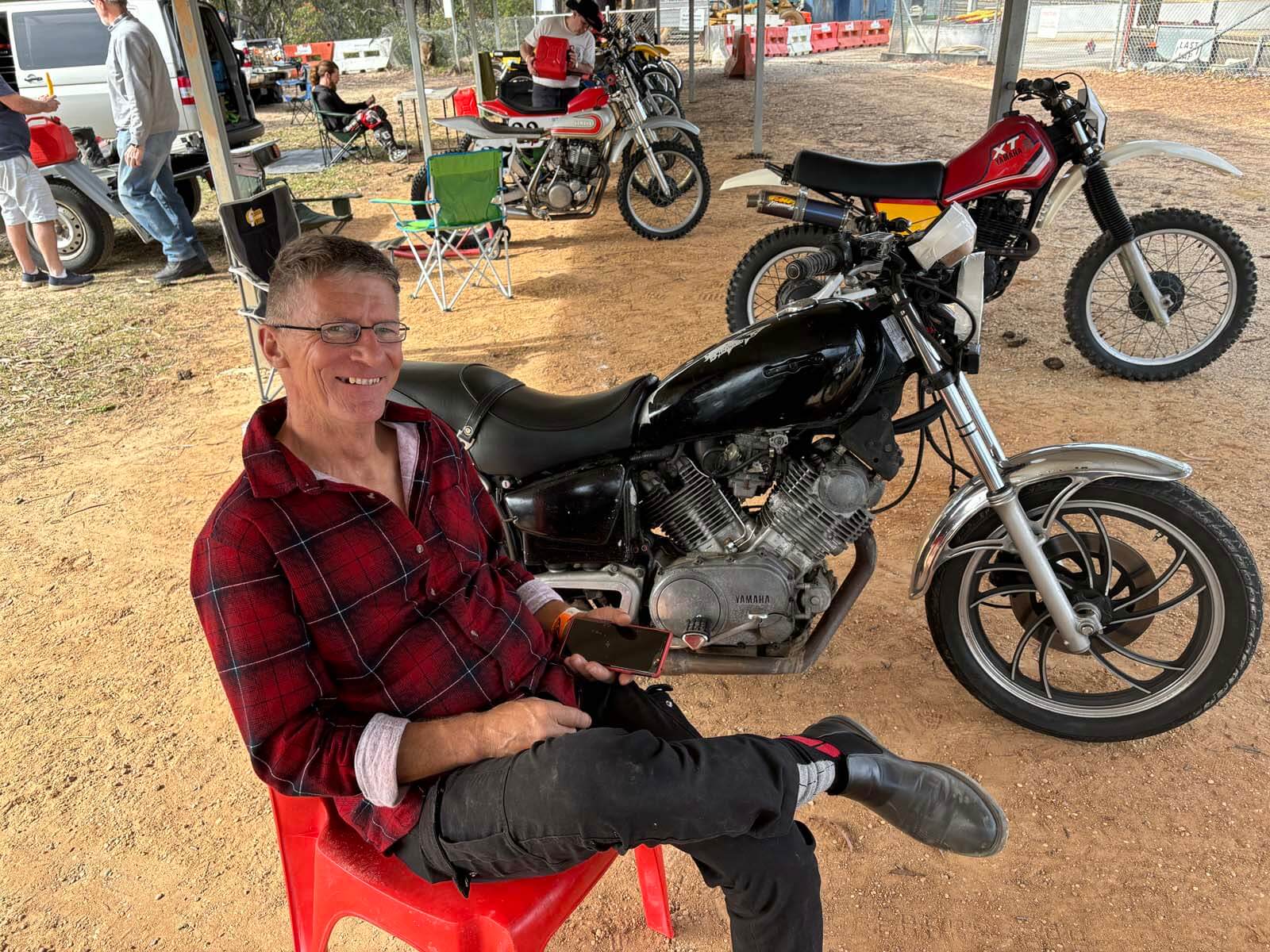 Sean's first race at Nepean dirt track in Western Sydney ended in a long walk back to the pits. The oversized 34mm carby did not want to deliver the right mix to the old chook chaser. And then the coil failed to provide a spark. Fortunately for Sean, the vintage dirt track community – aka the Jerkyls -  gathered round, donated an emergency coil and Sean managed to ride a few laps. Slowly.