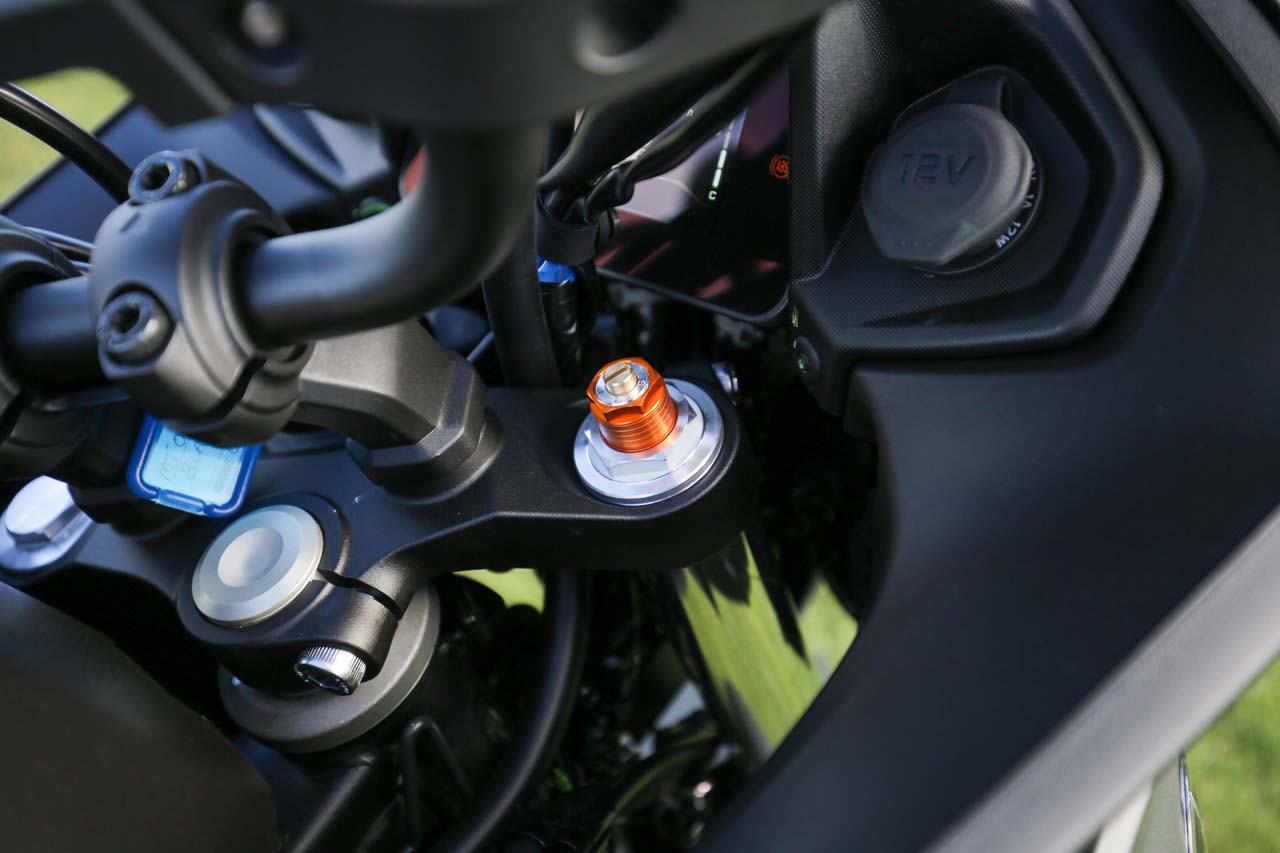 It’s also an extremely good-looking bike. The styling from front to rear is seamless, topped off by the frontal area with the daytime running lights and dual headlights that illuminate simultaneously. The black colour scheme with the gold wheels is my choice, and the quality of the finish is highlighted in subtle but important touches, such as the gold stitching on the seat. Every detail has been given a lot of thought, from the comfortable high handlebars to the cutting-edge TFT dashboard, which offers crystal clarity day and night with proper-sized numbers and letters. The vivid blue tachometer bar is a bonus.
