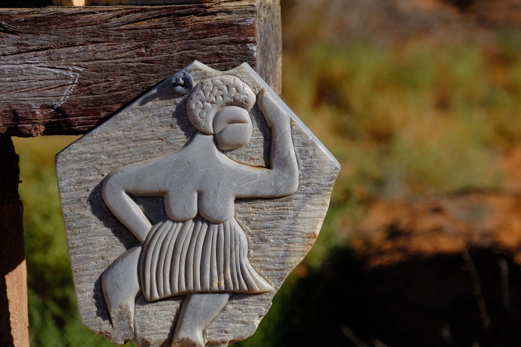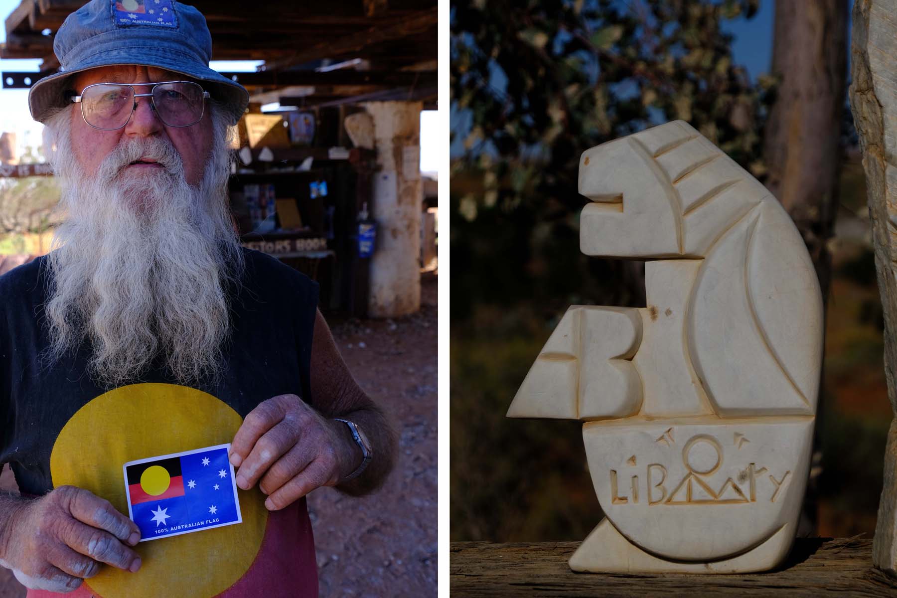 Talc Alf, whose official name is Cornelius Johan Alferink, was born in the Netherlands in 1945. In the 1960s he moved out to the edge of South Australia’s Sturt Stony Desert near Lyndhurst, where the Oodnadatta and Strzelecki tracks divide to head north and east respectively. He originally had a mail run, but he really wanted to work in the soft talc stone (hydrated magnesium silicate) found nearby at Mount Fitton. Since then, he has specialised in producing stylised carvings from the stone, although he also creates various other artworks.