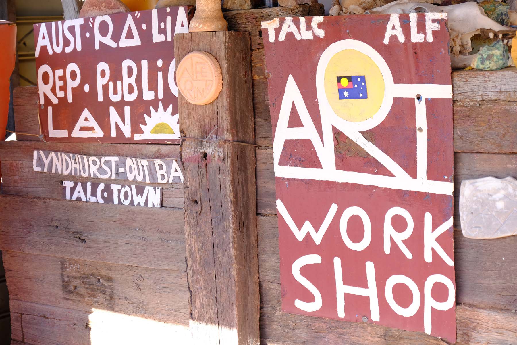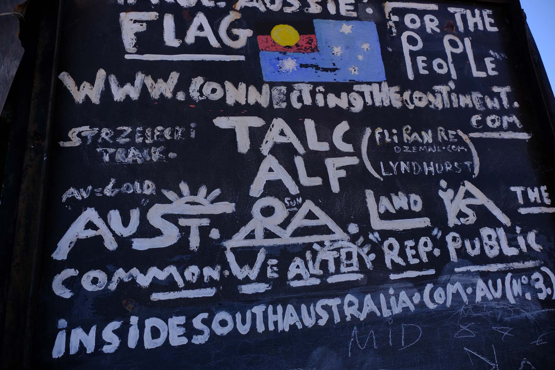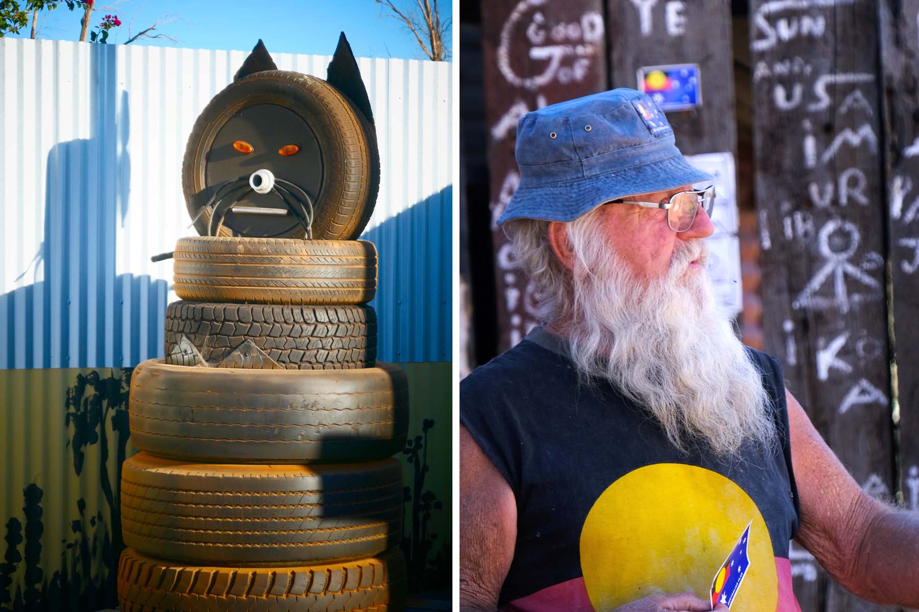 Alf welcomes visitors. He has also redesigned the Australian flag, and he proudly showed me his design in which the red, black and yellow Aboriginal flag replaces the Union Jack, simply and effectively swapping the colonial reference for an indigenous one. He gave me a flag sticker as I was leaving and I am having trouble deciding on somewhere worthy of it.