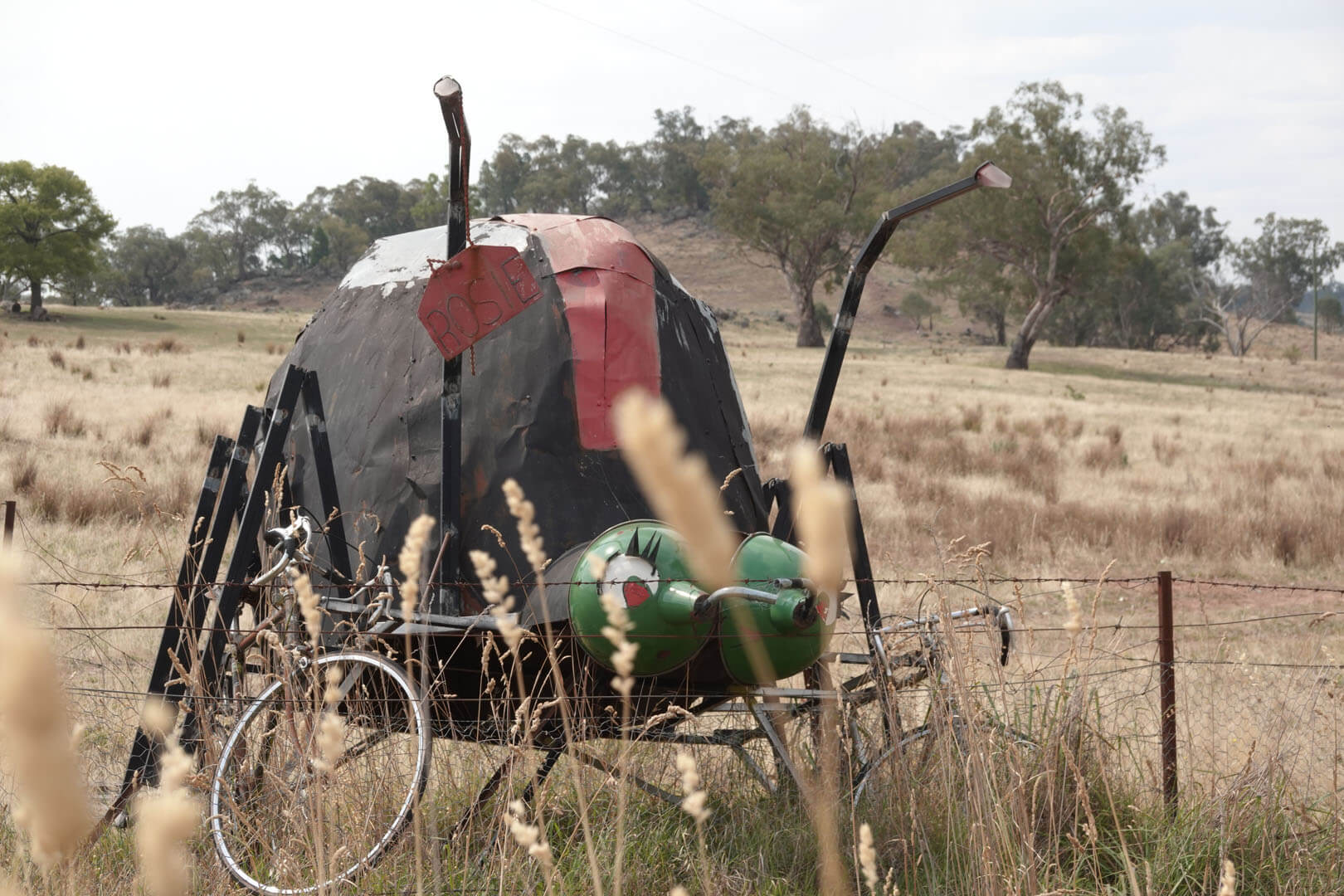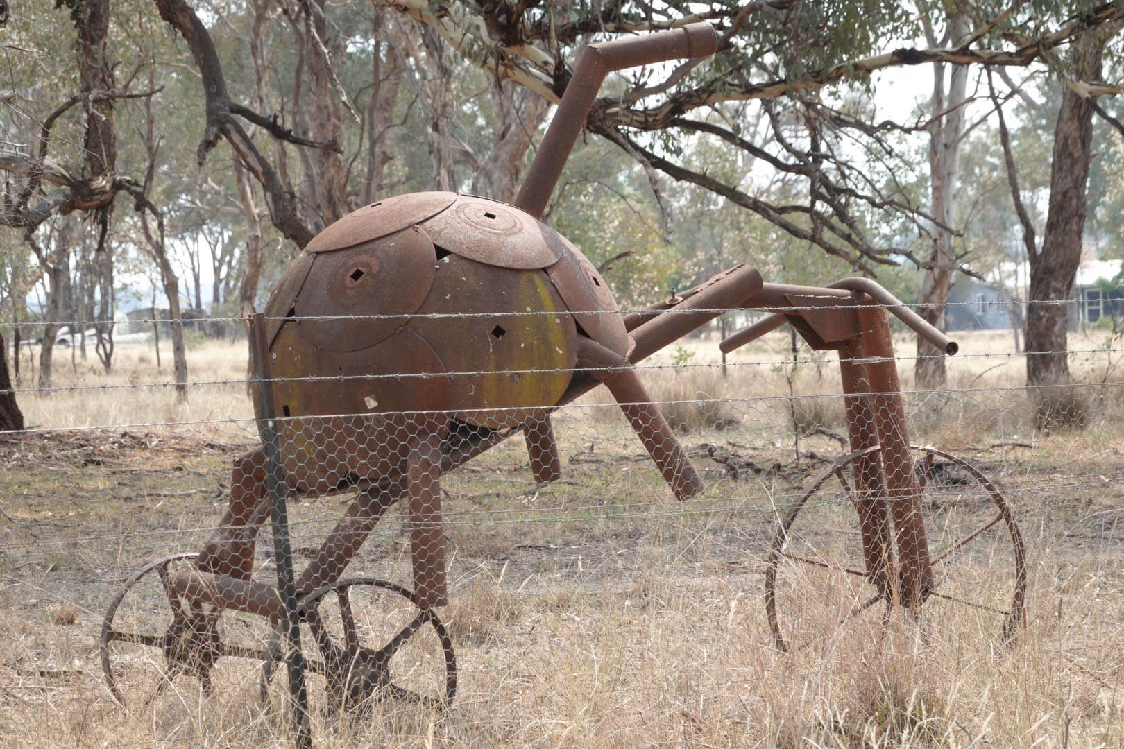"Animals on Bikes” is of course free and visible from any motorcycle, bicycle, car or bus and has given pleasure to passing travellers and benefited local businesses like the small General Store and café in Cumnock. If you’re travelling to Dubbo from Sydney, the sculpture trail is foreshadowed by the junk yard on the Mitchell Highway in Molong. Among the rusty remnants of Heaven knows what are some remarkably beautiful junk sculptures. Obley Road turns off to the left shortly afterwards, and the only difficulty is making sure you don’t miss any of the wheeled art along the 120km ride to Dubbo. The first sculpture that I’ve spotted (there may well be one or more before it) is a huge redback spider which naturally, has two bicycles not just one to keep its many legs busy.
