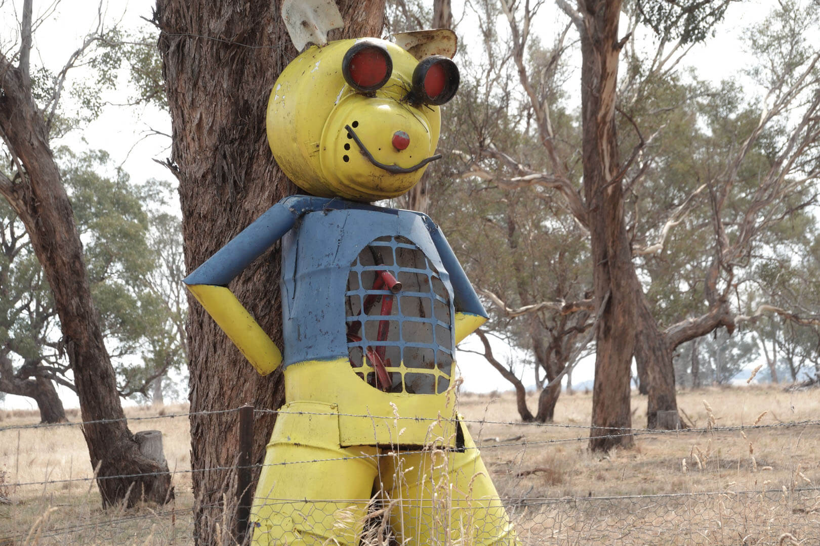 The Cumnock & District Progress Association organised welding classes through TAFE Outreach for the farmers' wives, Rentafarmhouse families and local enthusiasts that were keen to learn a new skill and create a masterpiece. Getting under way in 2009, the project ended up on a much larger scale than anticipated. It now numbers more than 100 pieces of outdoor art that can be enjoyed on the tourist trail which operates 365 days a year. It delights everyone who travels between Molong and Dubbo, from the young children and their parents travelling in school holidays to the retirees and travel bugs in their caravans all year round.